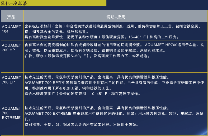 含合成酯的乳化液。不含有礦物油、氯、硫、磷和無甲醛釋放和殺菌劑。特別推薦用于所有研磨和切割加工,包括對鋁及其合金、鋼和鑄鐵的負荷加工。不適用于加工銅及黃色合金。具有高的耐微生物降解性。