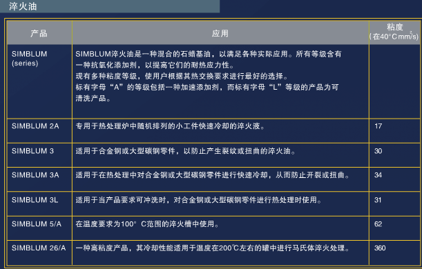 SIMBLUM 淬火油是一種混合的石蠟基油,以滿足各種實(shí)際應(yīng)用。所有等級含有一種抗氧化添加劑,以提高的耐熱應(yīng)力性。