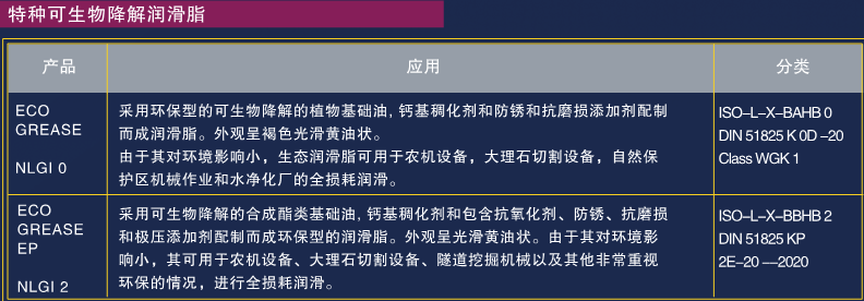 采用可生物降解的合成酯類(lèi)基礎(chǔ)油。鈣基稠化劑和包含抗氧化劑、防銹、抗磨損和極壓添加劑配制而成環(huán)保型的潤(rùn)滑脂。外觀呈光滑黃油狀。由于其對(duì)環(huán)境影響小,其可用于農(nóng)機(jī)設(shè)備,大理石切割設(shè)備、隧道挖掘機(jī)械以及其他非常重視環(huán)保的情況,進(jìn)行全損耗潤(rùn)滑。