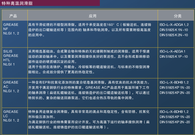 具有平滑紋理的不熔型潤(rùn)滑脂,適用于承受溫度在160度(板輸送機(jī)、連續(xù)鑄造爐的出口輥輸送機(jī)等)范圍內(nèi)的軸承和導(dǎo)軌潤(rùn)滑,以及所有需要耐極高溫度的應(yīng)用中。