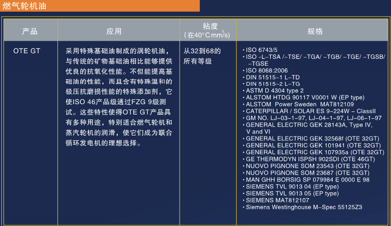 采用特殊基礎(chǔ)油制成的渦輪機油,與傳統(tǒng)的礦物基礎(chǔ)油相比能夠提供優(yōu)良的抗氧化性能。不但能提高基礎(chǔ)油的性能,而且含有特殊溫和的極壓抗磨損性能的特殊添加劑,它使ISO 46產(chǎn)品級通過FZG 9級測試。這些特性使得OTE GT產(chǎn)品具有多種用途,特別適合燃氣輪機和蒸汽輪機的潤滑,使它們成為聯(lián)合循環(huán)發(fā)電機的理想選擇。