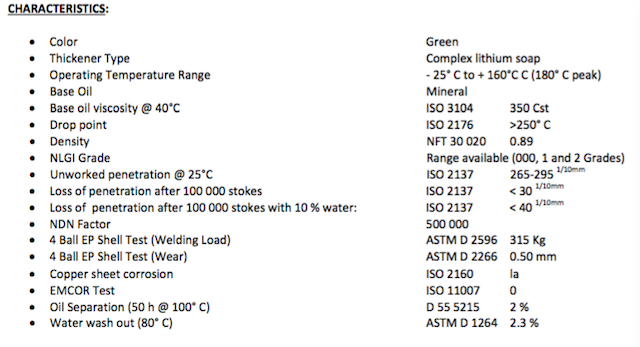 使用高粘度礦物油基礎(chǔ)油(40°C時(shí)為340m2/ s)和復(fù)合肥皂。優(yōu)良的耐水,耐負(fù)荷和耐溫性。提供高腐蝕保護(hù),確保設(shè)備保持良好狀態(tài)(運(yùn)動(dòng)間或維護(hù)期)。